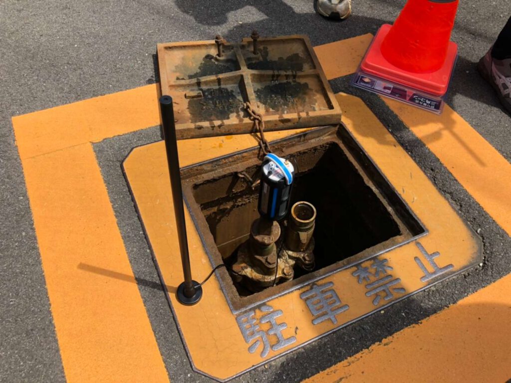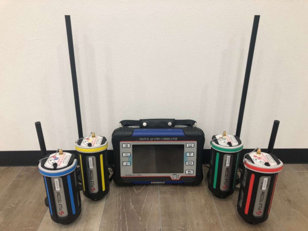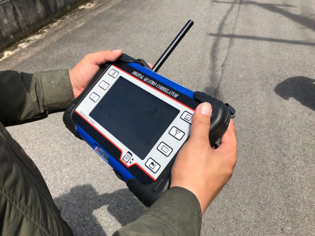 音聴調査が人の聴覚で調査するのに対し、相関式漏水調査は相関式漏水探知器を使用し、機械的に漏水箇所を見つける方法です。